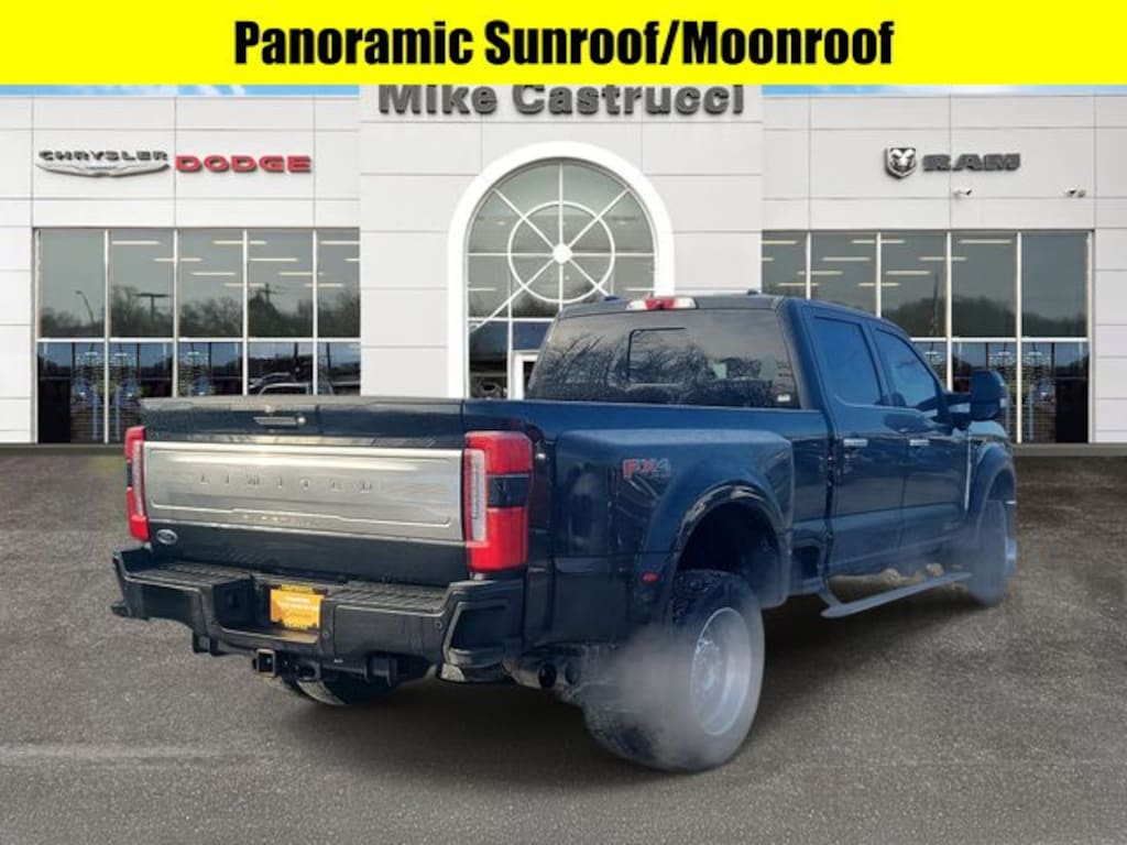 Certified. Black Metallic 2024 Ford F-450SD Limited DRW 4WD 10-Speed Automatic 6.7L High Output Power Stroke V8 Diesel APPLE CAR PLAY, BLUETOOTH HANDS FREE, Panoramic Sunroof/Moonroof, LOCAL TRADE, 4X4, Android Auto, Sunroof/Moonroof, One Owner!, 4WD, 4-Wheel Disc Brakes, ABS brakes, Adjustable pedals, Air Conditioning, Alloy wheels, AM/FM radio: SiriusXM with 360L, Auto High-beam Headlights, Auto tilt-away steering wheel, Auto-dimming Rear-View mirror, Automatic temperature control, Compass, Delay-off headlights, Driver door bin, Driver vanity mirror, Dual front impact airbags, Dual front side impact airbags, Dual rear wheels, Engine Block Heater, Exterior Parking Camera Rear, Flow-Through Console, Front Bucket Seats, Front Center Armrest, Front dual zone A/C, Front fog lights, Front reading lights, Front Wheel Well Liners (Pre-Installed), Fully automatic headlights, FX4 Off-Road Package, Garage door transmitter, GVWR: 14,000 lb Payload Package, Heated door mirrors, Heated front seats, Heated rear seats, Heated steering wheel, Hill Descent Control, Illuminated entry, Leather steering wheel, Memory seat, Navigation system: Connected Navigation (includes complimentary 1-year trial), Off-Road Specifically Tuned Shock Absorbers, Outside temperature display, Overhead airbag, Overhead console, Panic alarm, Passenger door bin, Passenger vanity mirror, Power door mirrors, Power driver seat, Power passenger seat, Power steering, Power windows, Radio: B&O Unleashed Sound System by Bang & Olufsen, Rain sensing wipers, Rapid-Heat Supplemental Cab Heater, Rear anti-roll bar, Rear reading lights, Rear seat center armrest, Rear Splash Guards/Mud Flaps (Pre-Installed), Rear step bumper, Rear window defroster, Remote keyless entry, Security system, SiriusXM Radio w/360L, Snow Plow Prep Package, Speed control, Split folding rear seat, Steering wheel memory, Steering wheel mounted audio controls, SYNC 4 w/Enhanced Voice Recognition, Tachometer, Telescoping steering wheel, Tilt steering wheel, Tough Bed Spray-In Bedliner, Traction control, Trip computer, Turn signal indicator mirrors, Unique FX4 Off-Road Box Decal, Variably intermittent wipers, Ventilated front seats.