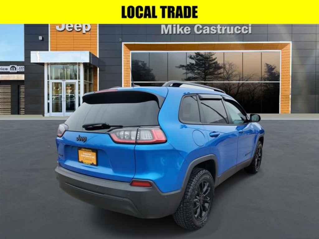 Certified. Hydro Blue Pearlcoat 2023 Jeep Cherokee Altitude 4WD 9-Speed 948TE Automatic 2.4L I4 APPLE CAR PLAY, BLUETOOTH HANDS FREE, LOCAL TRADE, 4X4, Android Auto, 3.734 Final Drive Ratio, 4-Wheel Disc Brakes, 6 Speakers, ABS brakes, Air Conditioning, Alloy wheels, AM/FM radio: SiriusXM, Anti-whiplash front head restraints, Apple CarPlay/Android Auto, Auto-dimming Rear-View mirror, Automatic temperature control, Brake assist, Bumpers: body-color, Compass, Driver door bin, Driver vanity mirror, Dual front impact airbags, Dual front side impact airbags, Electronic Stability Control, Emergency communication system: SiriusXM Guardian, Front Bucket Seats, Front Center Armrest, Front dual zone A/C, Front fog lights, Front License Plate Bracket, Front reading lights, Fully automatic headlights, Garage door transmitter, Heated door mirrors, Heated front seats, Heated steering wheel, Illuminated entry, Leather Shift Knob, Low tire pressure warning, Navigation System, Occupant sensing airbag, Outside temperature display, Overhead airbag, Overhead console, Panic alarm, ParkView Rear Back-Up Camera, Passenger door bin, Passenger vanity mirror, Power door mirrors, Power driver seat, Power Liftgate, Power passenger seat, Power steering, Power windows, Premium Leather Trimmed Bucket Seats, Quick Order Package 2BT, Radio data system, Radio: Uconnect 4C Nav w/8.4" Display, Rain sensing wipers, Rear reading lights, Rear seat center armrest, Rear window defroster, Remote keyless entry, Security system, Speed-sensing steering, Split folding rear seat, Steering wheel mounted audio controls, Telescoping steering wheel, Tilt steering wheel, Traction control, Trip computer, Voltmeter.