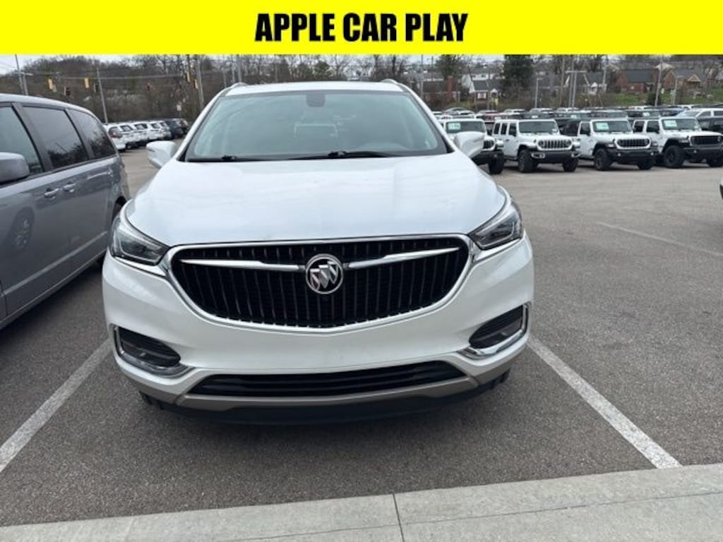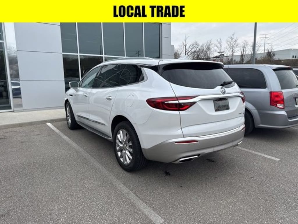White Frost Tricoat 2019 Buick Enclave Essence AWD 9-Speed Automatic 3.6L V6 SIDI VVT APPLE CAR PLAY, BLUETOOTH HANDS FREE, LOCAL TRADE, 4X4, Android Auto, Sunroof/Moonroof, AWD, 120-Volt Power Outlet, 1st & 2nd Row All-Weather Floor Liner (LPO), 3rd Row All-Weather Floor Liner (LPO), 4-Wheel Disc Brakes, 5000lbs Trailering Package, 6-Speaker Audio System Feature, ABS brakes, Air Conditioning, Alloy wheels, Apple CarPlay/Android Auto, Automatic temperature control, Bird's Eye View Surround Vision, Dual front impact airbags, Dual front side impact airbags, Floor Liner Package (LPO), Front dual zone A/C, Front Mounting License Plate Bracket Package, Front Power Sliding Moonroof, Fully automatic headlights, Garage door transmitter, Heated front seats, Heavy-Duty Cooling System, Illuminated entry, Integrated Cargo Liner (LPO), Occupant sensing airbag, Overhead airbag, Panic alarm, Passenger door bin, Power driver seat, Power Liftgate, Power Passenger Lumbar Control Seat Adjuster, Power passenger seat, Power steering, Power windows, Preferred Equipment Group 1SL, Premium audio system: Buick Infotainment System, Radio: Buick Infotainment Sys AM/FM Stereo w/Nav, Rear air conditioning, Rear Parking Sensors, Rear window defroster, Remote keyless entry, SiriusXM Radio, Steering wheel mounted audio controls, Telescoping steering wheel, Tilt steering wheel, Traction control, Trip computer, Variably intermittent wipers.