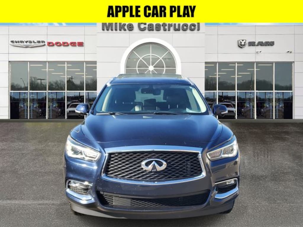 Hermosa Blue 2019 INFINITI QX60 LUXE AWD CVT 3.5L V6 APPLE CAR PLAY, BLUETOOTH HANDS FREE, Panoramic Sunroof/Moonroof, LOCAL TRADE, 4X4, Android Auto, Sunroof/Moonroof, 13 Speakers, 3rd row seats: bench, 4-Wheel Disc Brakes, ABS brakes, Air Conditioning, Alloy wheels, AM/FM radio: SiriusXM, Anti-whiplash front head restraints, Auto-dimming Rear-View mirror, Automatic temperature control, Brake assist, CD player, Delay-off headlights, Driver door bin, Driver vanity mirror, Dual front impact airbags, Dual front side impact airbags, Electronic Stability Control, Front Bucket Seats, Front Center Armrest w/Storage, Front dual zone A/C, Front fog lights, Front reading lights, Fully automatic headlights, Garage door transmitter: HomeLink, Heated Front Seats, Heated front seats, Heated steering wheel, Illuminated entry, Leather steering wheel, Leatherette Seat Trim, Outside temperature display, Overhead console, Panic alarm, Passenger door bin, Passenger vanity mirror, Power driver seat, Power Liftgate, Power moonroof, Power passenger seat, Power steering, Power windows, Radio data system, Rear air conditioning, Rear reading lights, Rear seat center armrest, Rear window defroster, Rear window wiper, Reclining 3rd row seat, Remote keyless entry, Security system, Speed-Sensitive Wipers, Split folding rear seat, Steering wheel memory, Steering wheel mounted audio controls, Tachometer, Telescoping steering wheel, Tilt steering wheel, Traction control, Trip computer, Variably intermittent wipers.