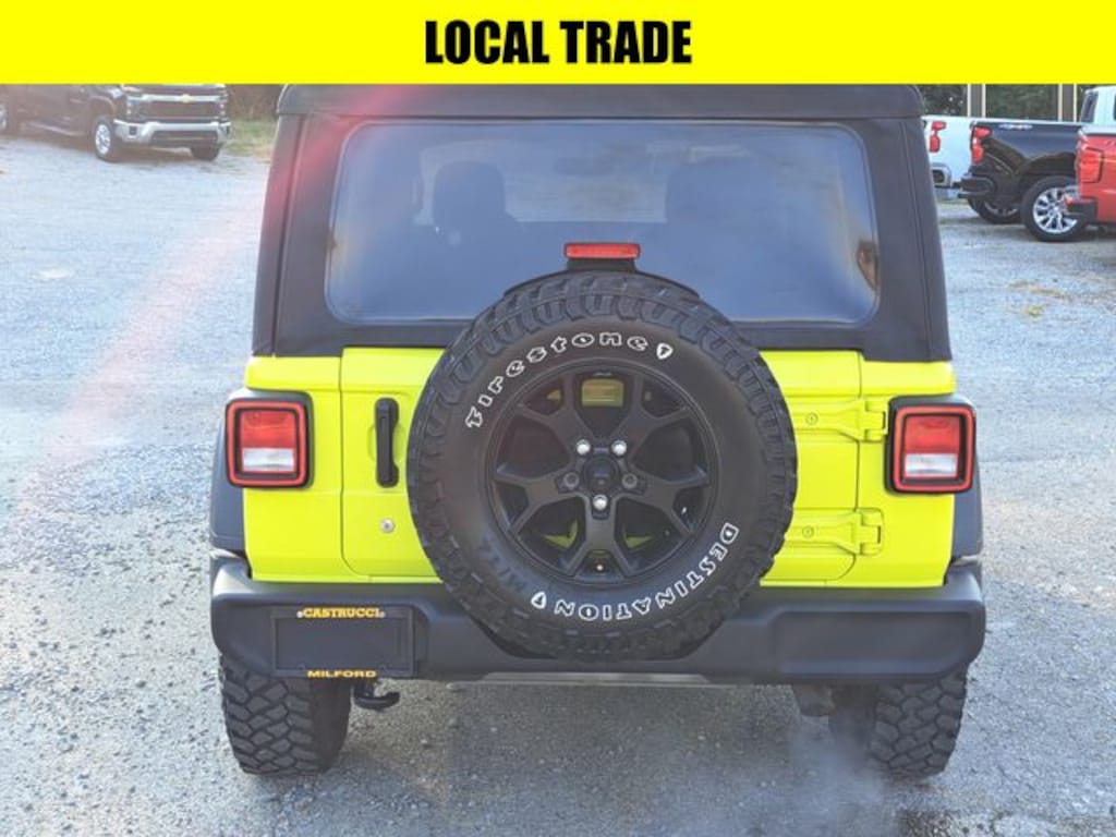 High Velocity Clearcoat 2023 Jeep Wrangler Sport 4WD 8-Speed Automatic 2.0L I4 DOHC APPLE CAR PLAY, BLUETOOTH HANDS FREE, LOCAL TRADE, 4X4, One Owner!, 4-Wheel Disc Brakes, 8 Speakers, ABS brakes, AM/FM radio, Apple CarPlay, Apple CarPlay/Android Auto, Aux Battery, Compass, Deep Tint Sunscreen Windows, Delay-off headlights, Driver door bin, Driver vanity mirror, Dual front impact airbags, Dual front side impact airbags, Engine Oil Cooler, Front fog lights, Front reading lights, Google Android Auto, GPS Antenna Input, Low tire pressure warning, Normal Duty Suspension, Occupant sensing airbag, Outside temperature display, ParkView Rear Back-Up Camera, Passenger vanity mirror, Power steering, Quick Order Package 22B Sport, Radio: Uconnect 4 w/7" Display, Rear anti-roll bar, Rear reading lights, Speed control, Steering wheel mounted audio controls, Stop-Start Dual Battery System, Tachometer, Telescoping steering wheel, Tilt steering wheel, Traction control, Trip computer, Variably intermittent wipers, Wheels: 17" x 7.5" Black Steel Styled.