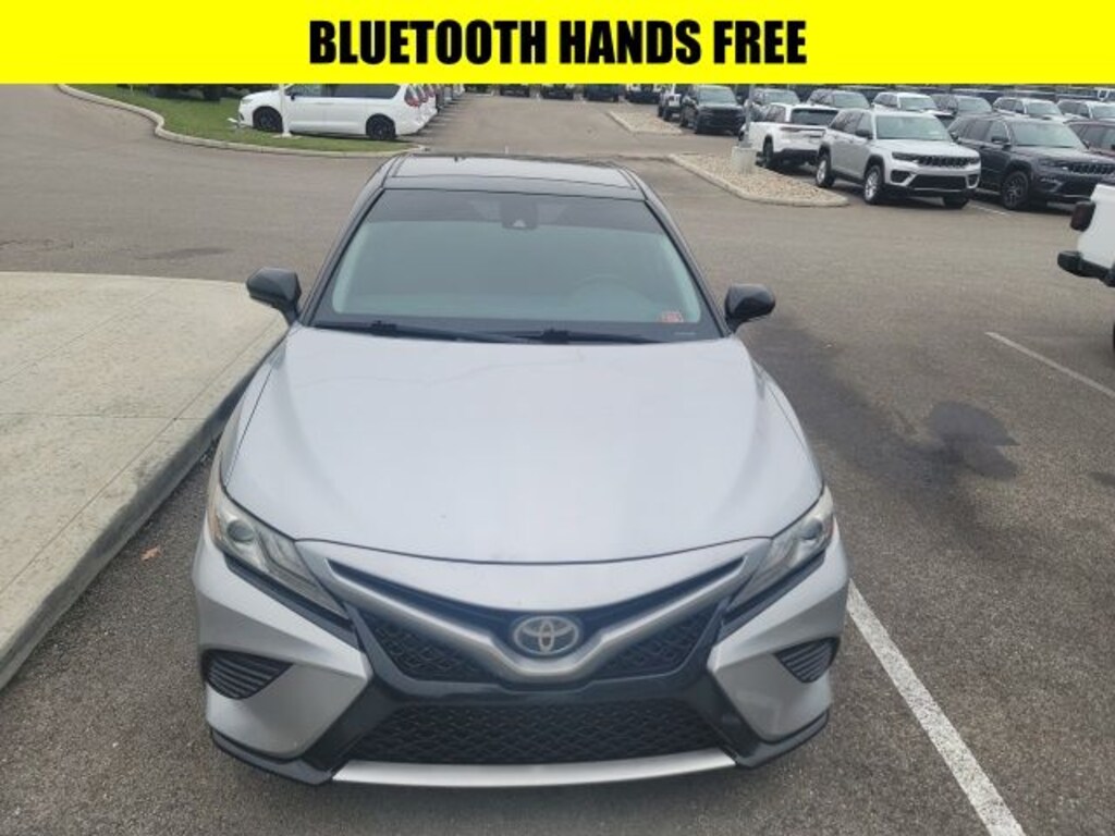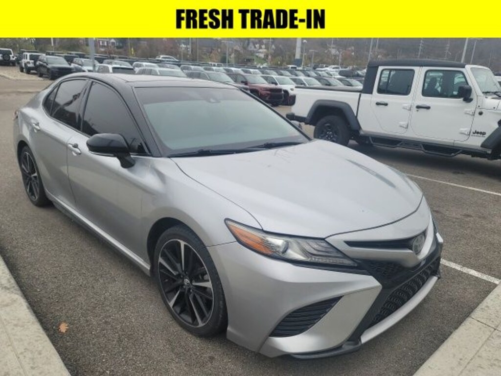 Celestial Silver/Midnight Black Metallic 2019 Toyota Camry XSE FWD 8-Speed Automatic 2.5L I4 DOHC 16V APPLE CAR PLAY, BLUETOOTH HANDS FREE, LOCAL TRADE, Android Auto, Sunroof/Moonroof, Black Leather, 4-Wheel Disc Brakes, 6 Speakers, ABS brakes, Air Conditioning, Alloy wheels, AM/FM radio: SiriusXM, Apple CarPlay, Auto-dimming Rear-View mirror, Automatic temperature control, Brake assist, CD player, Compass, Driver door bin, Driver vanity mirror, Dual front impact airbags, Dual front side impact airbags, Exterior Parking Camera Rear, Front Bucket Seats, Front Center Armrest, Front dual zone A/C, Front reading lights, Heated front seats, Illuminated entry, Overhead console, Passenger door bin, Passenger vanity mirror, Perforated Leather Seat Trim, Power driver seat, Power passenger seat, Power steering, Power windows, Radio data system, Radio: Entune 3.0 Premium Audio w/JBL w/Clari-Fi, Rear reading lights, Rear window defroster, Remote keyless entry, Split folding rear seat, Steering wheel mounted audio controls, Tachometer, Telescoping steering wheel, Tilt steering wheel, Traction control, Trip computer.