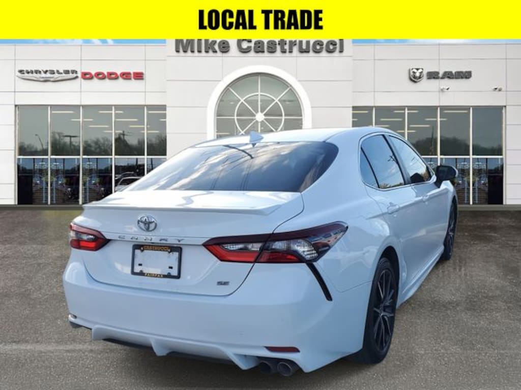 White 2021 Toyota Camry SE FWD 8-Speed Automatic 2.5L I4 DOHC 16V APPLE CAR PLAY, BLUETOOTH HANDS FREE, LOCAL TRADE, Android Auto, Black Cloth, 4-Wheel Disc Brakes, 6 Speakers, ABS brakes, Active Cruise Control, Air Conditioning, Alloy wheels, AM/FM radio: SiriusXM, Apple CarPlay/Android Auto, Automatic temperature control, Bumpers: body-color, Driver door bin, Driver vanity mirror, Dual front impact airbags, Dual front side impact airbags, Electronic Stability Control, Fabric Seat Trim w/Sport SofTex, Front Bucket Seats, Front Center Armrest, Front reading lights, Illuminated entry, Low tire pressure warning, Occupant sensing airbag, Outside temperature display, Overhead console, Panic alarm, Passenger door bin, Passenger vanity mirror, Power door mirrors, Power driver seat, Power steering, Power windows, Radio data system, Radio: AM/FM Audio System, Rear seat center armrest, Rear window defroster, Remote keyless entry, Security system, Speed control, Split folding rear seat, Spoiler, Tachometer, Telescoping steering wheel, Tilt steering wheel, Traction control, Trip computer, Variably intermittent wipers.